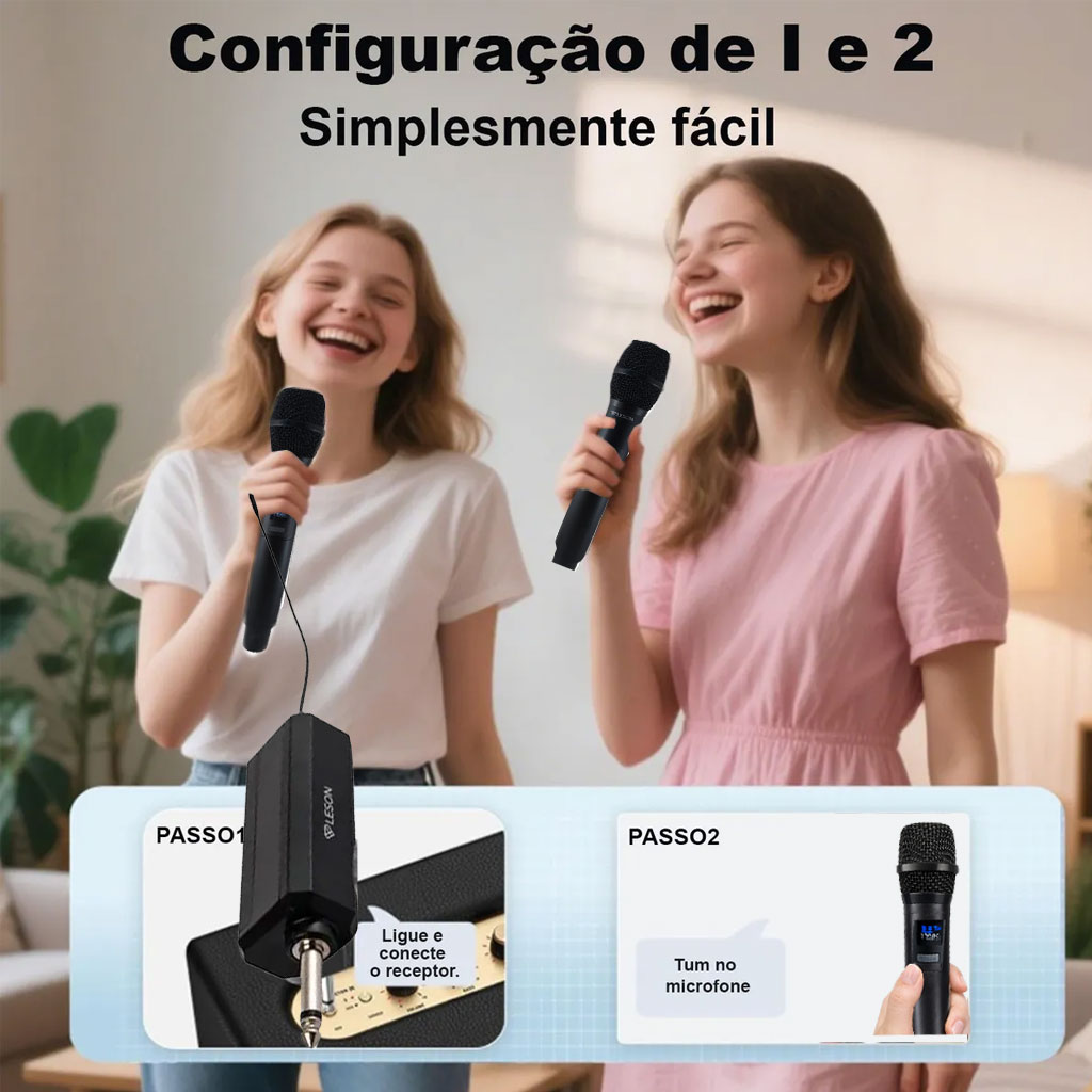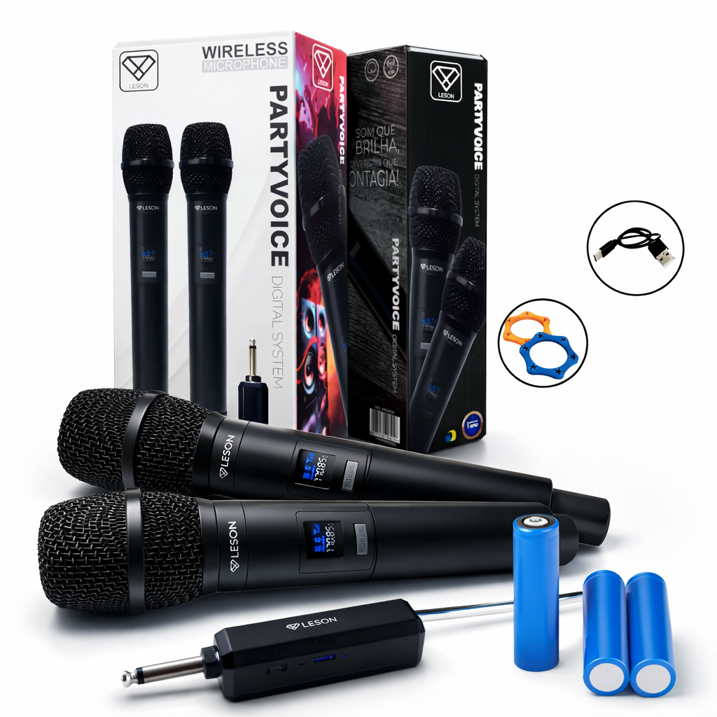 O modelo Party Voice é composto por dois microfones, permitindo que você compartilhe momentos especiais com amigos e familiares. Ideal para eventos sociais, ele se destaca pela facilidade de uso e conectividade sem fio, proporcionando liberdade de movimento durante as apresentações.