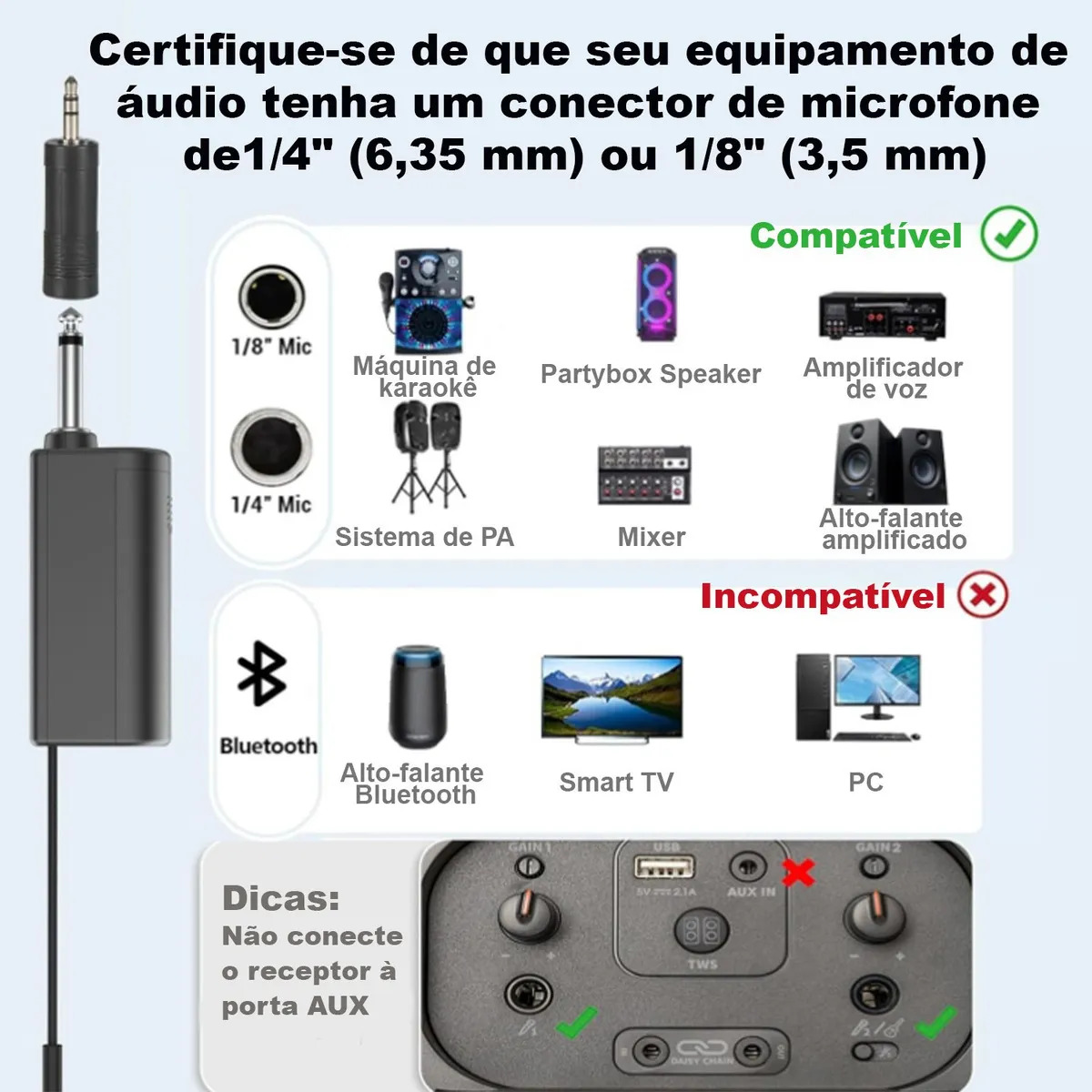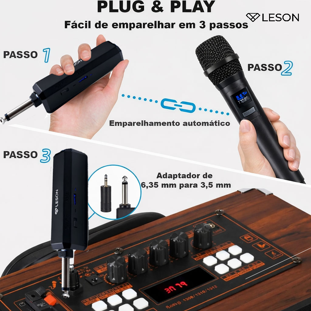 Receptor Portátil: Equipado com conector P10 e botão on/off para facilitar o uso.